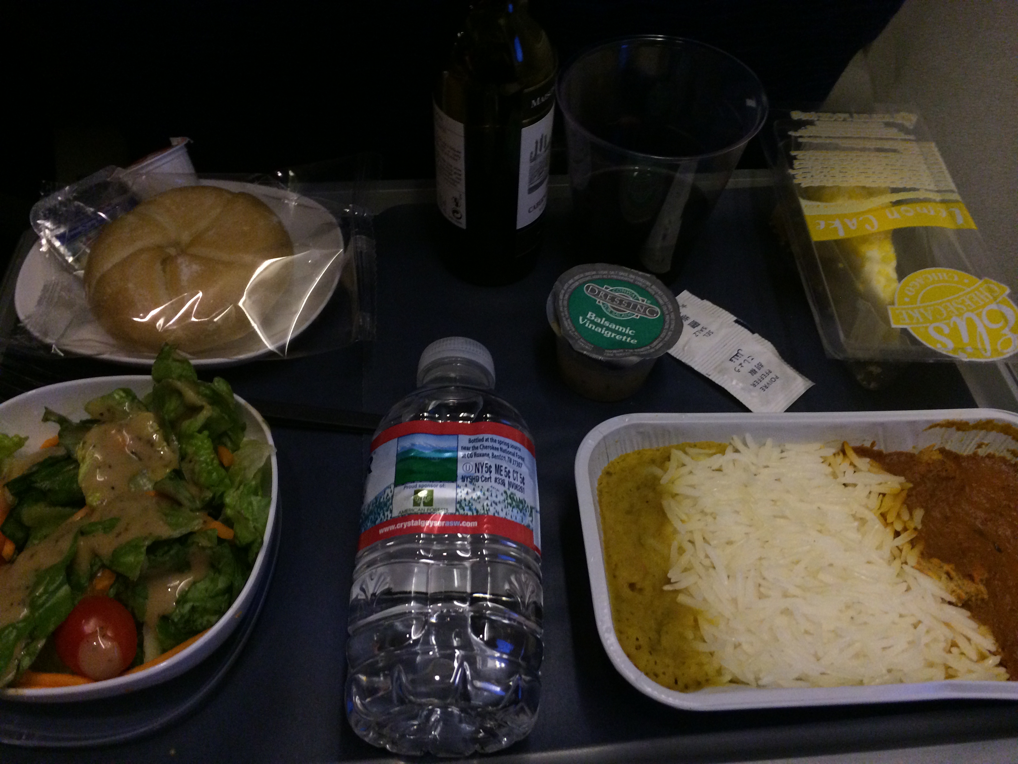 Trying not to think of the steak and lobster I’m sure they’re enjoying in First Class…dinner was a rather tasty curry chicken! “Turkey curry…my favorite!” ~Bridget Jones