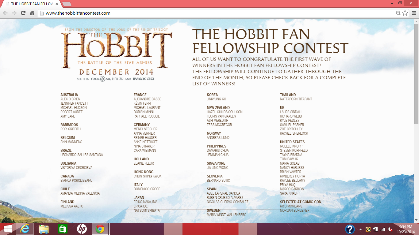 FOR A COMPLETE LIST OF WINNERS visit: http://www.thehobbitfancontest.com/