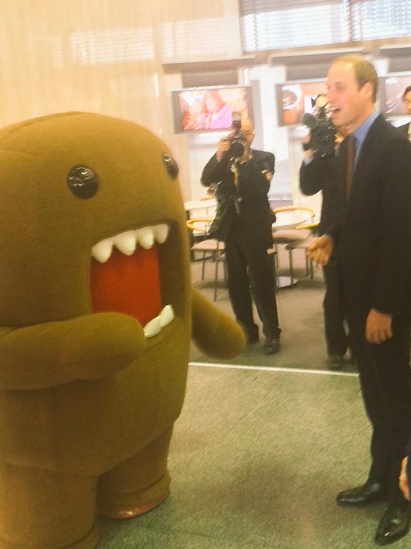 As he left the building, The Duke of Cambridge met NHK’s mascot Domo-Kun and he laughed as it bowed to him and offered his hand to shake.