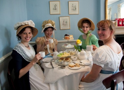 Make your tea party truly memorable by inviting guests to don Jane Austen Regency gowns! (Photo: Katrina Casey, Regency Tea Room Bath, England)
