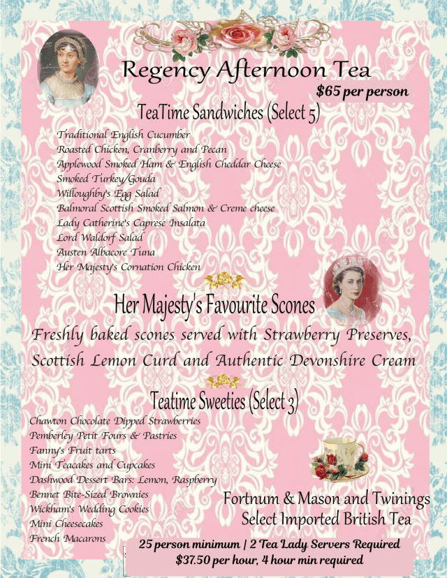 Our uniquely entertaining Austentacious Afternoon Tea is like no other tea experience around. Imagine scenes from Jane Austen’s most beloved novels, such as Pride and Prejudice, performed right before your very eyes, all while enjoying a traditional 3-course afternoon tea. Imagine tea with Mr. Darcy or Elizabeth Bennet! Our Pemberley Players also interact with our guests and are available for photos – but remember, conversation is strictly limited to 19th Century drawing room fare! Limited bookings are accepted for this special occasion tea. Not all dates are available. For more information, inquire at: SensibiliTeasCatering@gmail.com.